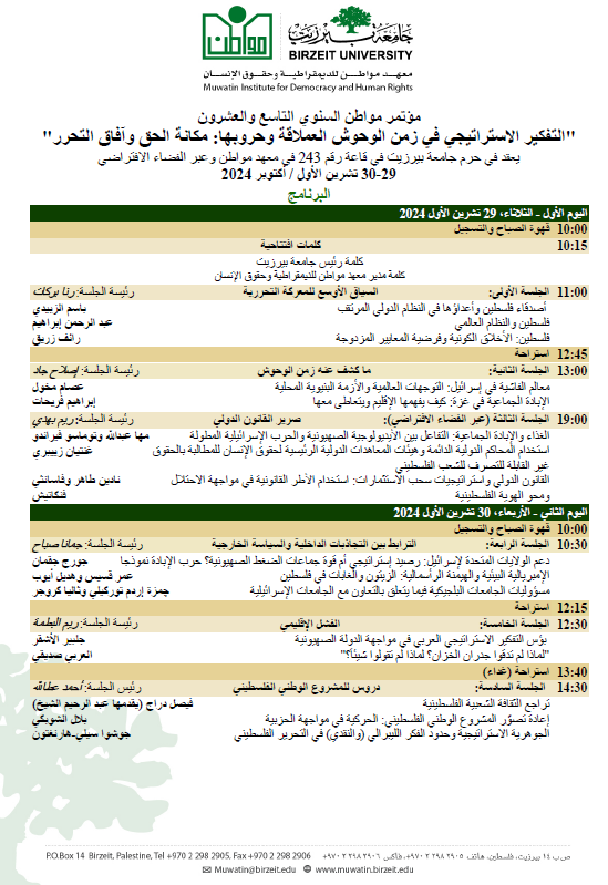 Muwatin Institute for Democracy and Human Rights began as a primary unit in Birzeit University in 2016. This institute is the result of the combination of the Palestinian Institute for the Study of Democracy – Muwatin (founded in 1991 in Ramallah) incorporation into the university, joining with the Master’s Program in Democracy and Human Rights (founded in the Faculty of Graduate Studies in 1999), along with several other activities related to this academic program ...