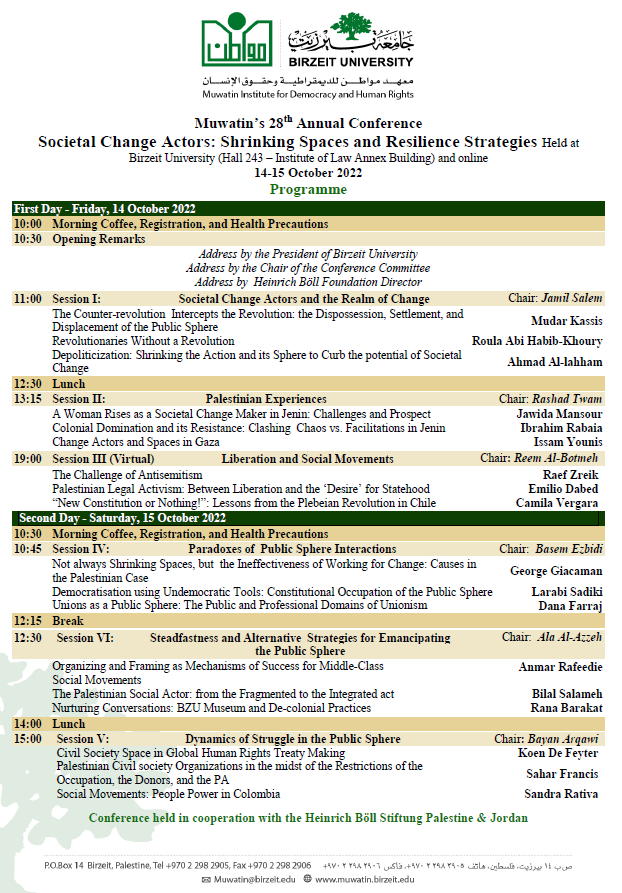 Muwatin’s 28th Annual Conference will discuss these issues, focusing on the spaces for societal change actors and societal change within the public sphere. These will be discussed under four main rubrics: